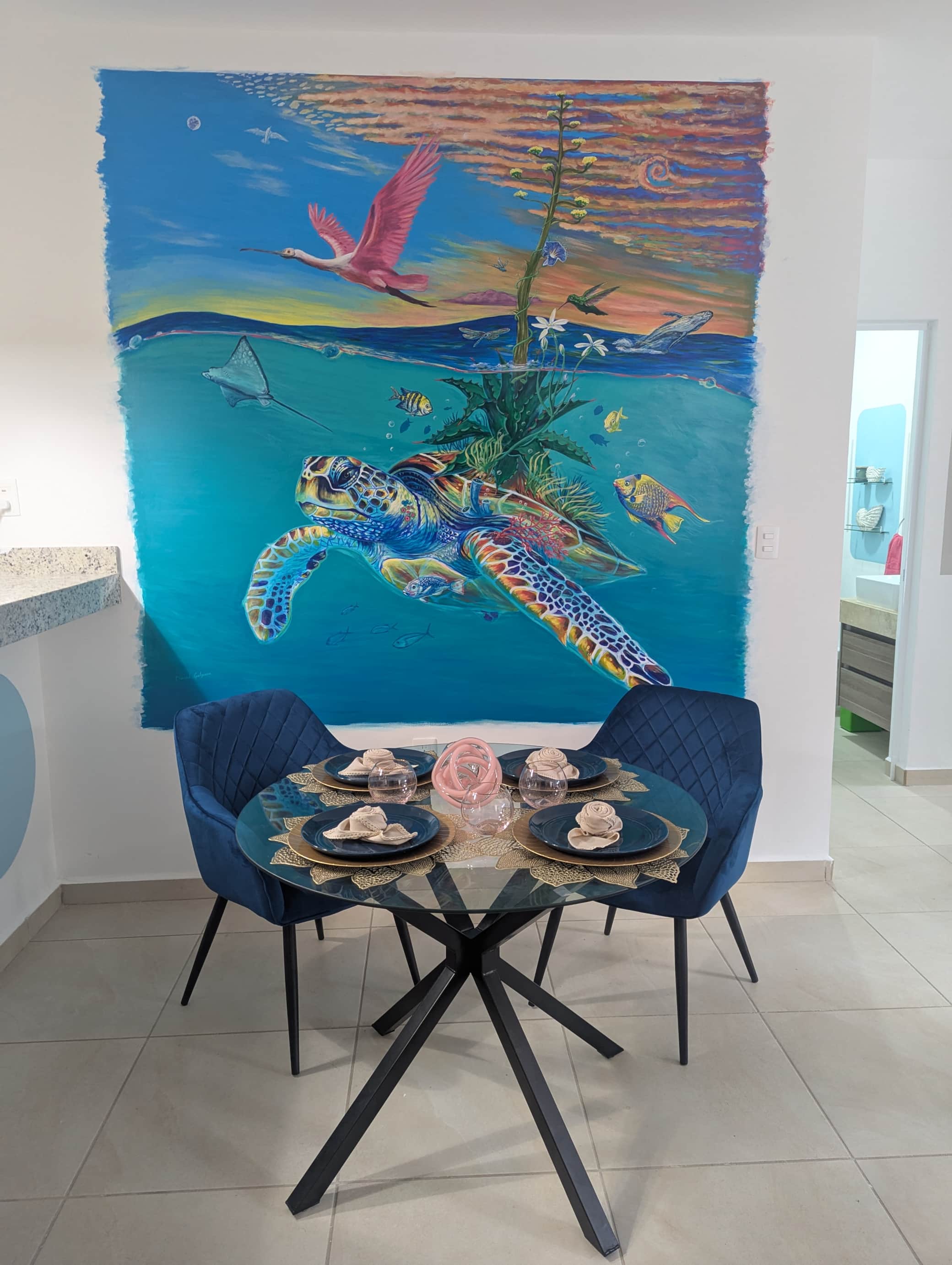 Tortuga’s Dream Vacation Homeaway is a whimsical short-term rental inspired by the Mayan Riviera. This unique apartment features an original magical realism mural called A Tortuga’s Dream by Oaxacan artist Daniel Galguera, which dominates the dining/living space. The mural’s flowing seascape inspires the bright, airy interiors blended with playful accents, offering comfort with personality.